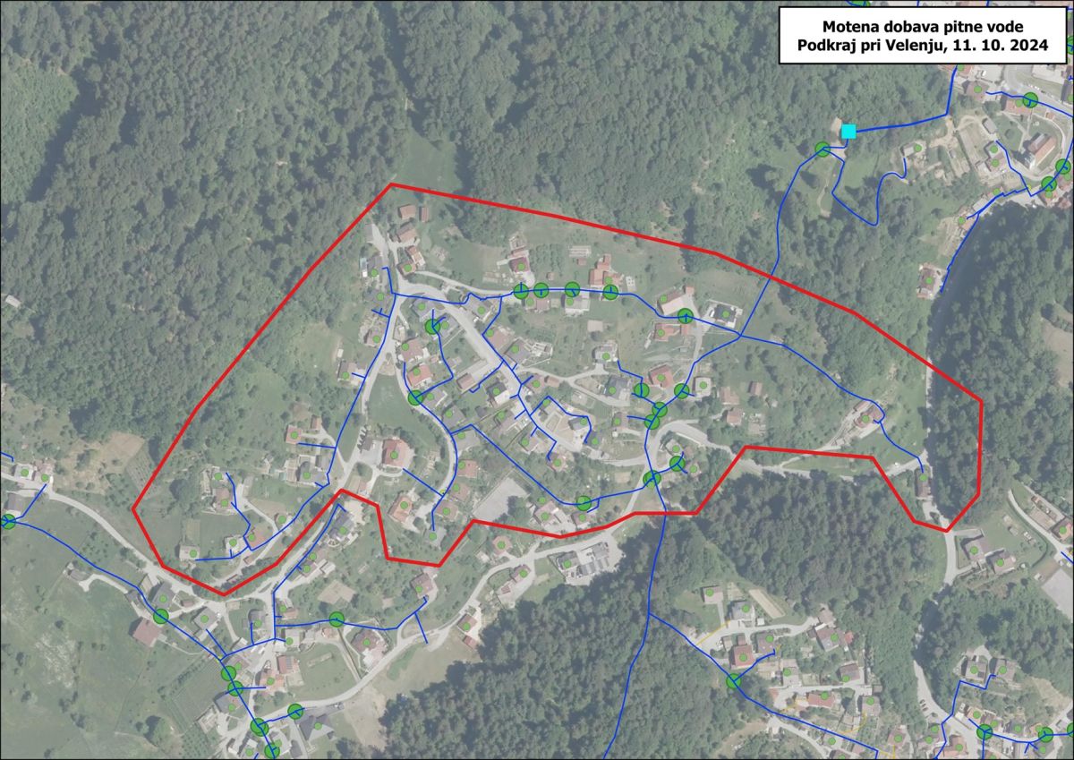 Komunalno podjetje Velenje obvešča uporabnike na območju naselja Podkraj pri Velenju (del, ki je označen na sliki), da bo jutri, v petek, 11. oktobra 2024, med 8. in 15. uro, zaradi nujnih vzdrževalnih del na javnem vodovodu prekinjena oz. motena dobava pitne vode.
