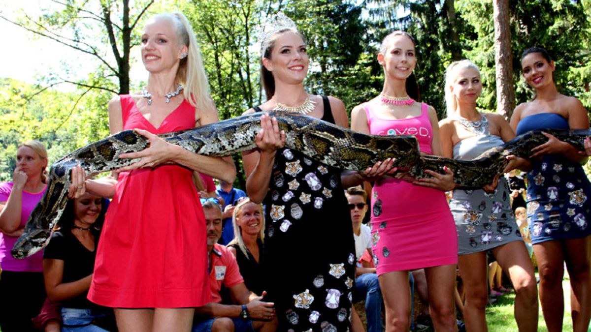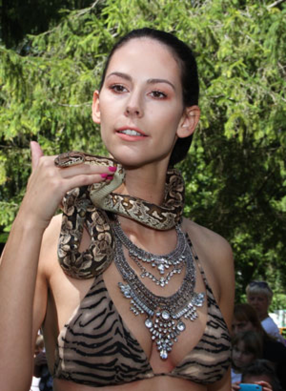 mozirskem parku so pripravili prav posebno modno revijo. Dolgonoga dekleta, ki so predstavljala modne utrinke poletja, so se na trenutke poistovetile z eksotičnimi plazilci. Ženska lepota ovita v udave in pitone ali ob bradatem kuščarju agama (na čelu z aktualno miss Slovenije Majo Teradi) se je zrcalila med njimi in se dopolnjevala z oblačili in nakitom na osončeni koži, tako, da so mnogoštevilnim gledalcem vstale vsaj vse kocine. Ob ding-dang glasbi, medklicih moderatorja in zvijanju drobnih strupenjač v pisanih vzorcih ob ujemajočih se ornamentih na pomanjkljivo oblečenih hostesah, je v šolsko uro trajajoč sprehod po pisti, zadovoljil poglede in kamere prisotnih. Gledalci so zlahka prezrli pomanjkljivosti, saj so bili graciozno lepi detajli in srhljivost ovijanja kačje kože o krog vratov, zapestij ali za krpice oblačil, privlačnost brez primere. Vrhunec šova je bil zadnji izhod, ko je kar šest manekenk in asistentk prineslo zvijajočega se pitona Boba, težkega nad 50 kg. Bila je to prava poslastica za množico zmedenih amaterjev in fotografov ter navijaških gledalcev, ki so si dušo odvezali tudi s sočnimi komentarji.
