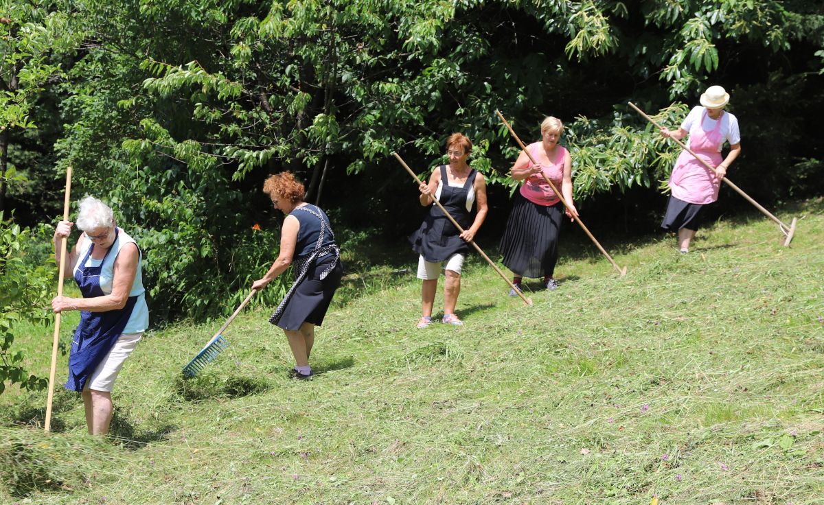 »Ej, Marko, tale je pa le še za kose brusit,« je jezikala ena grabljica, ki ji je sonce že krepko zakuhalo skozi naglavni facel. Še zadnje otiranje kose s travo, brušenje s kamnom in padle so še zadnje redi. Ravno zaplesali po raztrošeni travi niso, bilo pa je čutiti radost in veselo razpoloženje, saj so vsi že vnaprej vedeli, da jih čaka obilna malica, obara z žganci in kar nekaj vrst sladic, ki so obogatile veliko mizo v senci kajžice in lesenega napušča. Še tople je postregla domača gospodinja, svoje mojstrovine pa so prinesle tudi nekatere grabljice, ki vedo, kako se ob sušavi streže lačnim koscem. In spet so zapeli zbrani okrog obložene mize, razdirali šale ter obujali svoje bolj ali manj posrečene folklorne podvige. Travo je bilo treba že kmalu še enkrat obrniti, kar pa grabljicam še malo ni bilo težko. Vajene in utrjene so kar zaplesale po blagi strmini in na dogodek bodo ostali, tudi zapisani, lepi spomini.