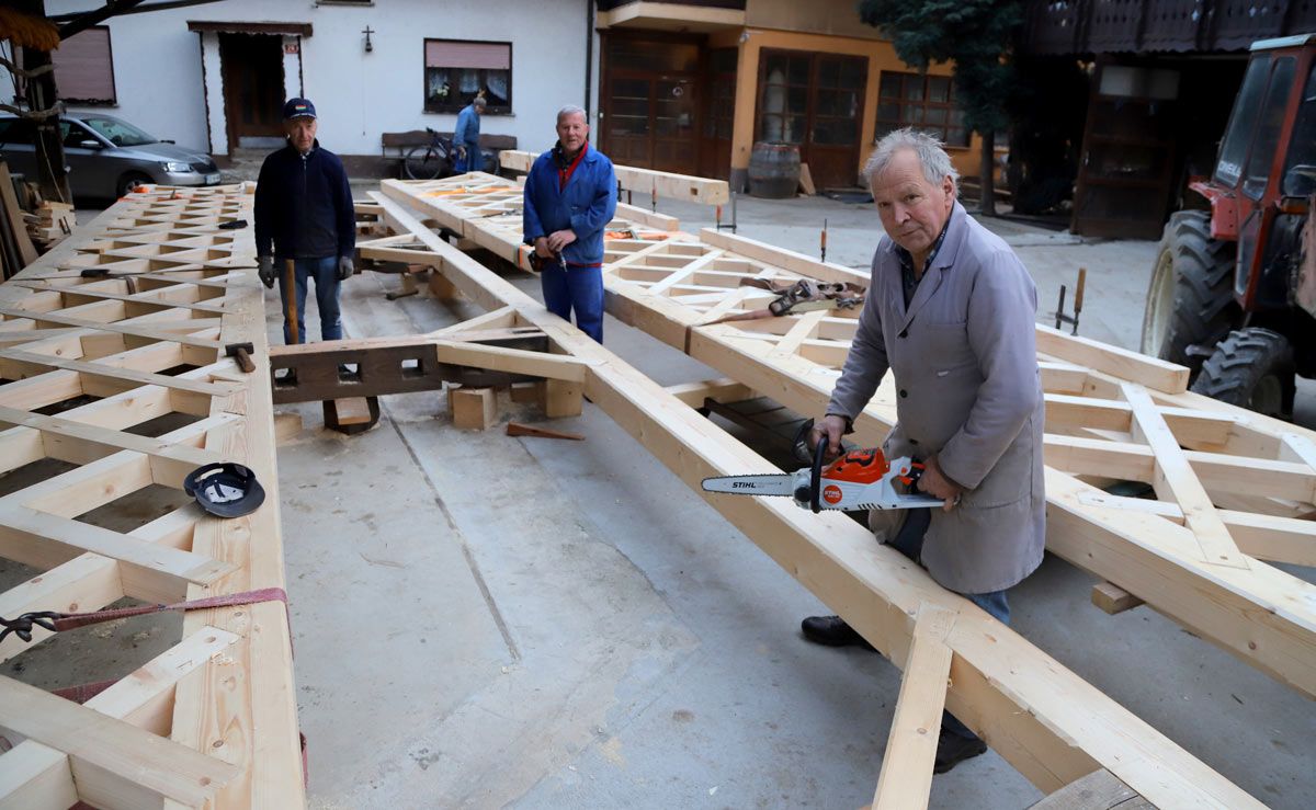 Mojster Florjan Strmšek iz Paške vasi gradi nov stari kmečki kozolec
