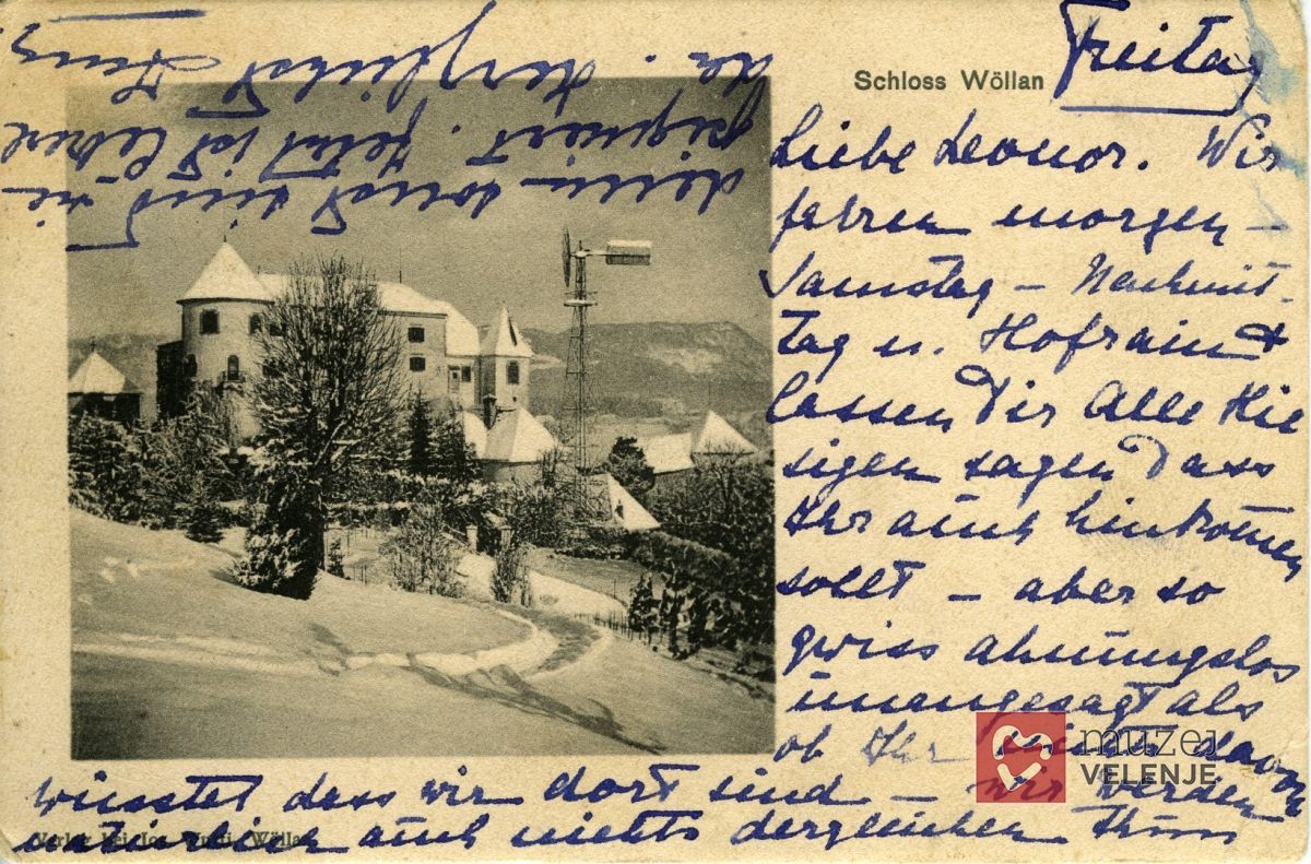 Med lepše zbirke Muzeja Velenje nedvomno sodi izredno bogata zbirka razglednic Šaleške doline. Med njimi po svoji zanimivosti izstopajo tiste razglednice Gradu Velenje, na katerih našo pozornost poleg stavbe pritegne še visoka vetrnica na južni strani renesančnega poslopja.