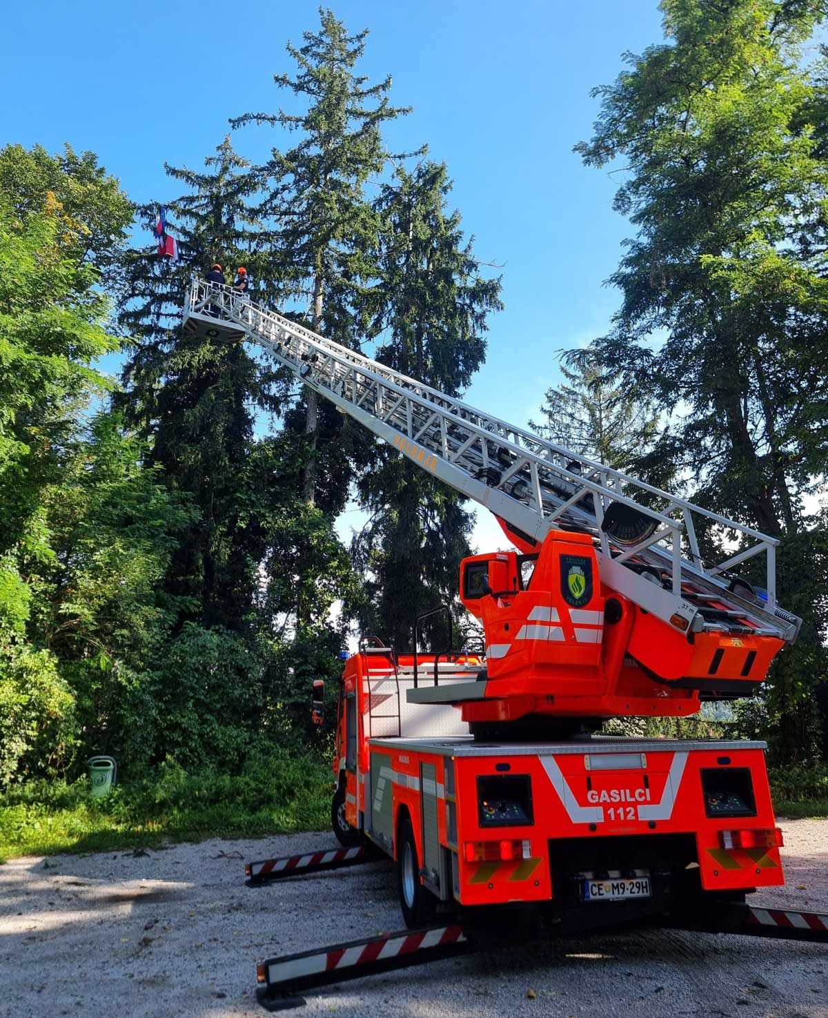 Tako se je zgodilo pred nekaj meseci, ko je zastavo odtrgalo z droga in jo odneslo visoko v smreke na parkirišču ob skakalnicah. Takrat so nam prijazno na pomoč priskočili gasilci in zastavo rešili z drevesa s pomočjo dvižne lestve. Ker je bil poškodovan tudi drog za zastavo, smo morali naročiti rezervne dele in ko smo jih dobili, smo naročili alpinistom, da so splezali na streho, drog podrli, na novo namestili vso ustrezno opremo za obešanje in dvigovanje zastave in drog ter zastavo namestili nazaj na svoje mesto, da zopet plapola visoko nad Velenjem.