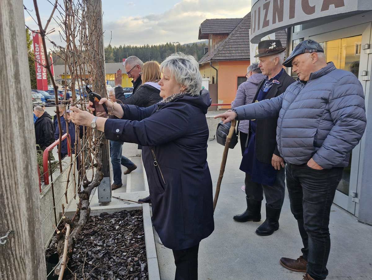Šmartno ob Paki, 19. marca ‒ Že več kot 10 let po zaslugi Društva vinogradnikov Šmartno ob Paki na sotočju rek Pake in Savinje negujejo posebno vinogradniško dediščino – potomko najstarejše vinske trte na svetu – modro kavčino. Ta raste v vinogradih članov društva, zasadili pa so jo tudi na ploščadi pred šmarško občinsko upravo in tamkajšnjo knjižnico. Pred tednom dni sta lastnica slednje (občina Šmartno ob Paki in v njenem imenu župan Janko Kopušar) ter skrbnica trte (predsednica omenjenega društva Mojca Praprotnik) povabili ljubitelje žlahtne kapljice na 11. rez občinske modre kavčine. Med udeleženci družabnega dogodka sta bila tudi podžupanja Mestne občine Velenje Darinka Mravljak ter podžupan občine Šoštanj Boris Lambizer. Oba sta ob tej priložnosti pomagala trto obrezati. Njuna prisotnost ni bila naključna. Polovica članov društva vinogradnikov je namreč iz omenjenih lokalnih skupnosti.