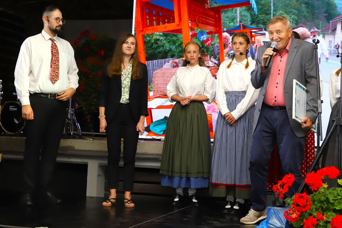 Nato sta sedla na staro vaško klop Julijana Klemenšek in Edvard Ikovic, oba predsednika društva zgodnjih mandatov delovanja, ter v klepetu, v katerega se je občasno vključeval tudi glasnik preteklosti in prihodnosti Buši, strastno spregovorila o tistih lepih časih na vasi in trdem delu, ki je bilo zelena nit sodelovanja vseh dejavnikov in razvoja turizma v kraju. Ko so ob visokem prazniku v znak hvaležnosti obema podelili priznanji Zahvalna listina, jima je roko stisnil tudi podpredsednik Turistične zveze Slovenije in predsednik RTZ SAŠKA Franc Špegel, ki je v kratkem nagovoru čestital društvu za sodelovanje in uspehe pri sodelovanju v kraju in regiji ter spodbudil mlado predsednico, naj ta generacija prispeva k nadaljevanju povezanosti ter turistični odličnosti Logarske doline, Solčavskega in zgornjesavinjske turistične destinacije.