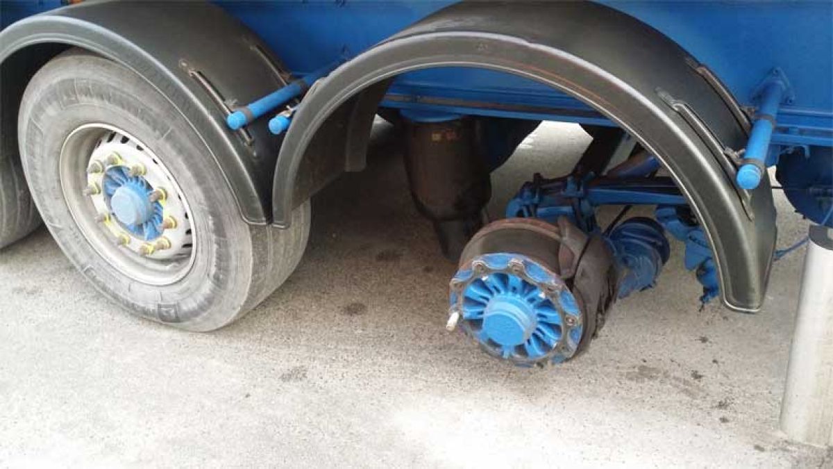 Pri kontroli so policisti ugotovili, da na priklopnem vozilu manjka eno izmed treh koles na desni strani.