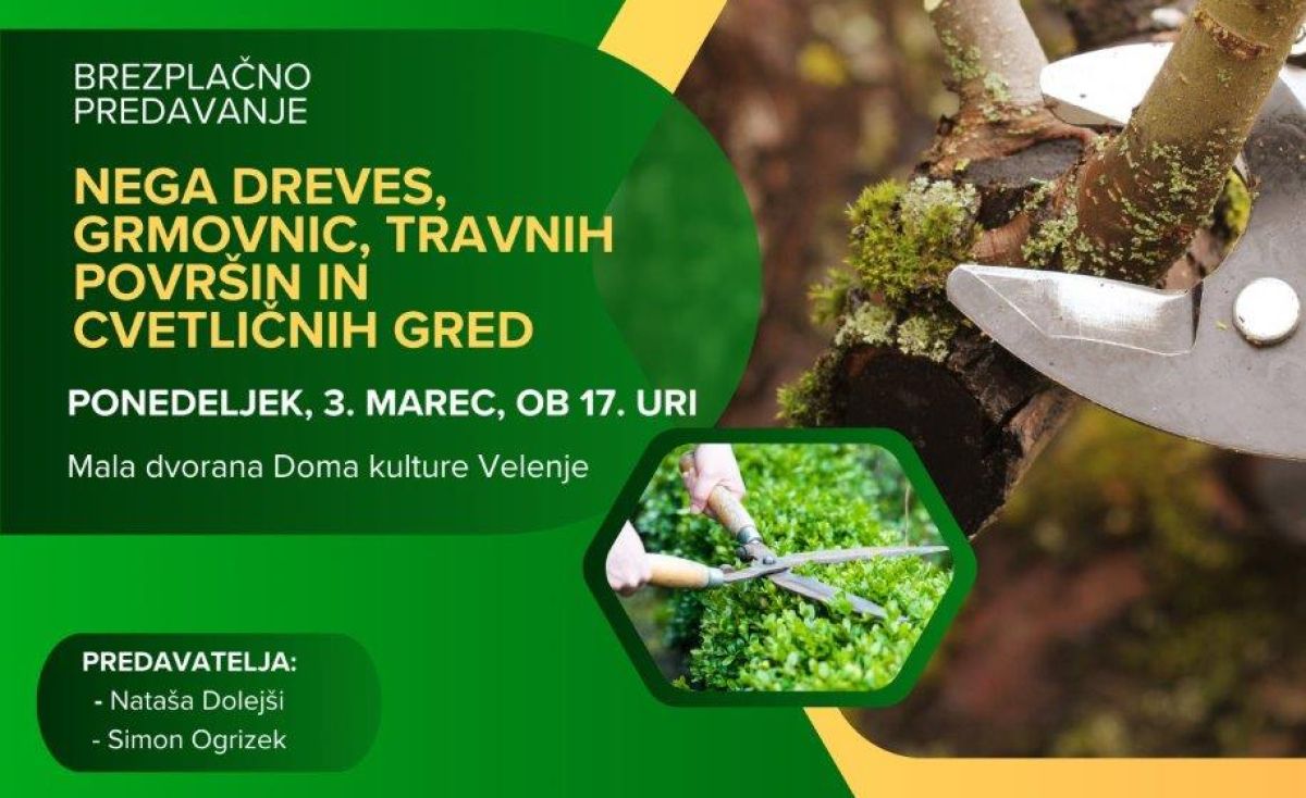 Z namenom ozaveščanja o pravilni negi drevnin, grmovnic in zelenih površin bo Mestna občina Velenje v ponedeljek, 3. marca 2025, ob 17. uri v mali dvorani Doma kulture Velenje organizirala brezplačno predavanje. Dogodek je namenjen predvsem lastnikom individualnih hiš, etažnim lastnikom in drugim zainteresiranim posameznikom, saj za urejanje drevnine, grmovnic in zelenih površin na javnih površinah skrbi koncesionar. Predavatelja mag. Nataša Dolejši, univerzitetna diplomirana inženirka agronomije, in Simon Ogrizek, diplomirani inženir agronomije in hortikulture, bosta spregovorila o negi grmovnic, travnih površin, nasadov gred s sezonskim cvetjem in zeliščnih trajnic.
