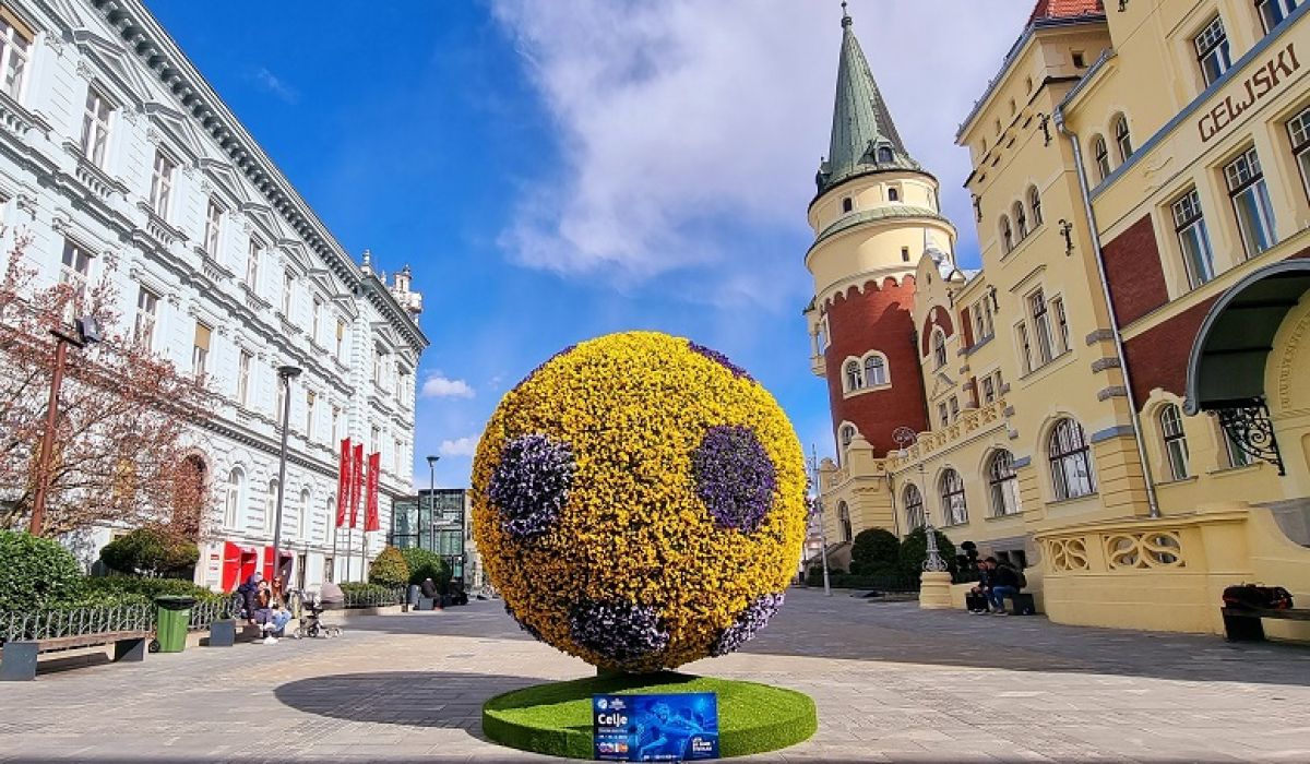 Ker bo Celje prihodnji teden gostilo Evropsko nogometno prvenstvo U21, je cvetlična žoga zasajena v duhu nogometa. Krasi jo 2240 rumenih in modrih mačeh in je resnično prava paša za oči. Javno podjetje Zelenice, ki skrbi za urejanje zelenih in javnih površin v Celju, bo mačehe čez približno dva tedna presadilo v Mestni park in na javne površine, konstrukcija pa bo še več let služila za zasaditev cvetja, ki bo lahko prilagojeno različnim pomembnim dogodkom.