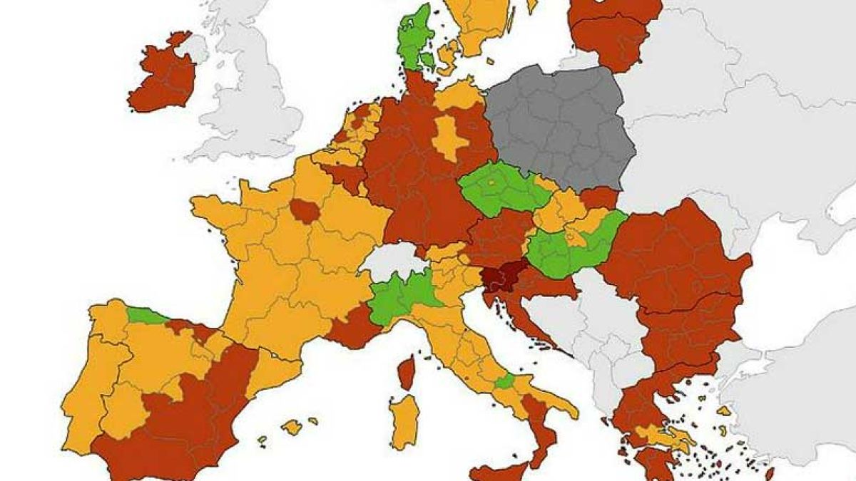 Celotna Slovenija je na novem epidemiološkem zemljevidu Evropskega centra za obvladovanje in preprečevanje bolezni (ECDC) označena s temno rdečo barvo. Glede na zemljevid je Slovenija edina s tako slabo epidemiološko situacijo; nobena druga regija v EU ni temno rdeča. Za Poljsko sicer ni na voljo dovolj podatkov.