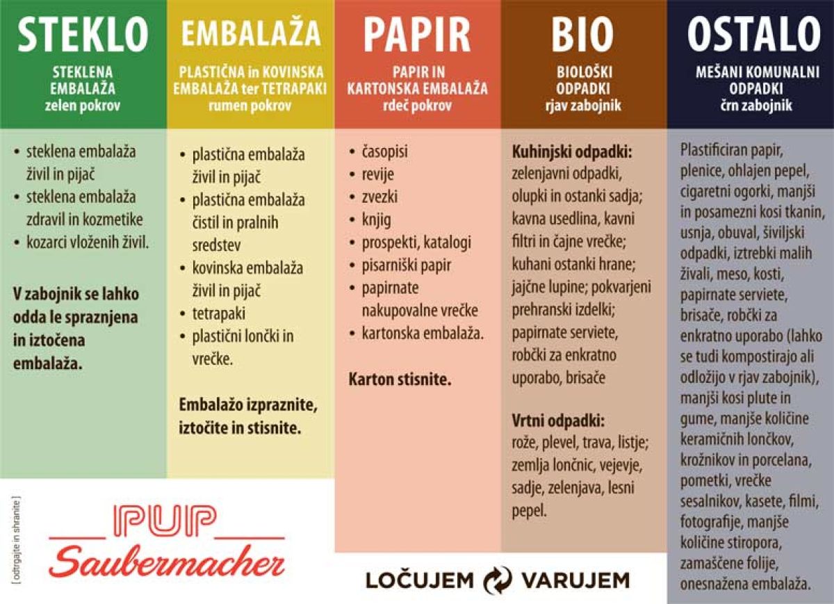 V skladu z zakonodajo se vsi odpadki zbirajo ločeno na izvoru, torej že v gospodinjstvih. V Našem času (št. 43) smo objavili preglednico, ki si jo v primeru, da boste kdaj v dilemu, kam sodi kakšen odpadek, lahko izrežete in namestite na pregledno mesto.