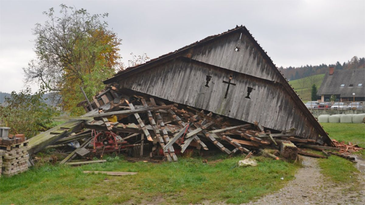 Bevče pri Velenju, 29. oktobra– Kaj se zgodi, če ne vzdržujemo stavb, je pokazal velik kozolec, ki se je zrušil sam vase.