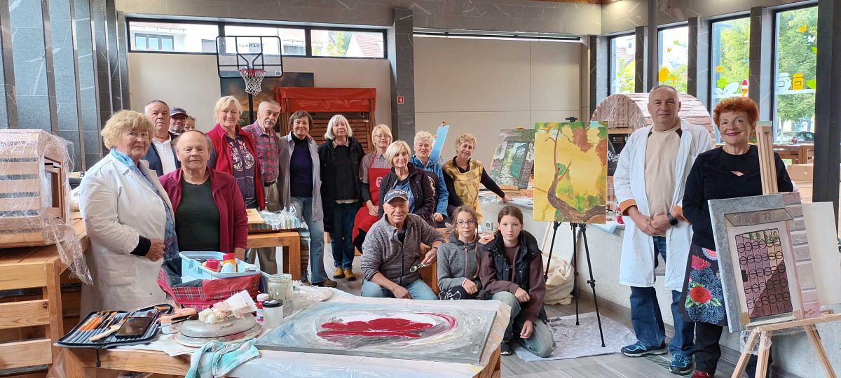 Šoštanj, 14. septembra – Člani Društva šaleških likovnikov in Društva Harmonija Šoštanj so četrto leto organizirali Trško likovno kolonijo, na kateri ustvarjajo likovna dela, ki jih podarijo Občini Šoštanj za protokolarna darila. Navadno ustvarjajo na ulicah Šoštanja, kjer jih z zanimanjem opazujejo tudi meščani, tokrat pa so zaradi slabega vremena poiskali zavetje na šoštanjski tržnici. Alimpije Košarkoski, pobudnik kolonije, je povedal, da se jim je letos pridružilo 21 likovnikov, ki so se prijavili na razpis na temo V očeh umetnika. Poleg tistih iz Velenja in Šoštanja so prišli tudi s Polzele in Ormoža. »Kolonijo organiziram zato, da se v Šoštanju nekaj dogaja, da se družimo, širimo naša obzorja. Tako se tudi mi udeležimo kolonij v drugih krajih in vrnemo obisk,« je povedal Košarkoski. Četudi »skriti« v tržnici, so imeli obiskovalce, med drugim so jih prišli pozdraviti podžupanja Urška Kurnik, predsednica KS Šoštanj Maša Stropnik in nekateri občinski svetniki.