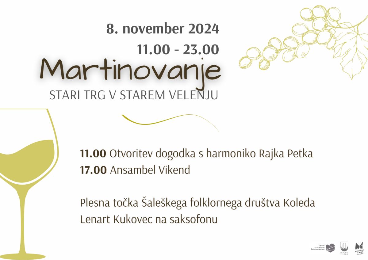 V petek, 8. novembra 2024, vas vabimo, da se nam pridružite na Martinovanju v Starem Velenju, kjer bomo skupaj nazdravili slovenski vinogradniški tradiciji in praznovali trenutek, ko se mošt spremeni v vino. Vinarji iz različnih vinorodnih okolišev Slovenije bodo s svojimi izbranimi vini poskrbeli za razvajanje vaših brbončic, obiskovalci boste lahko uživali tudi v Martinovih in jesenskih dobrotah lokalnih ponudnikov.