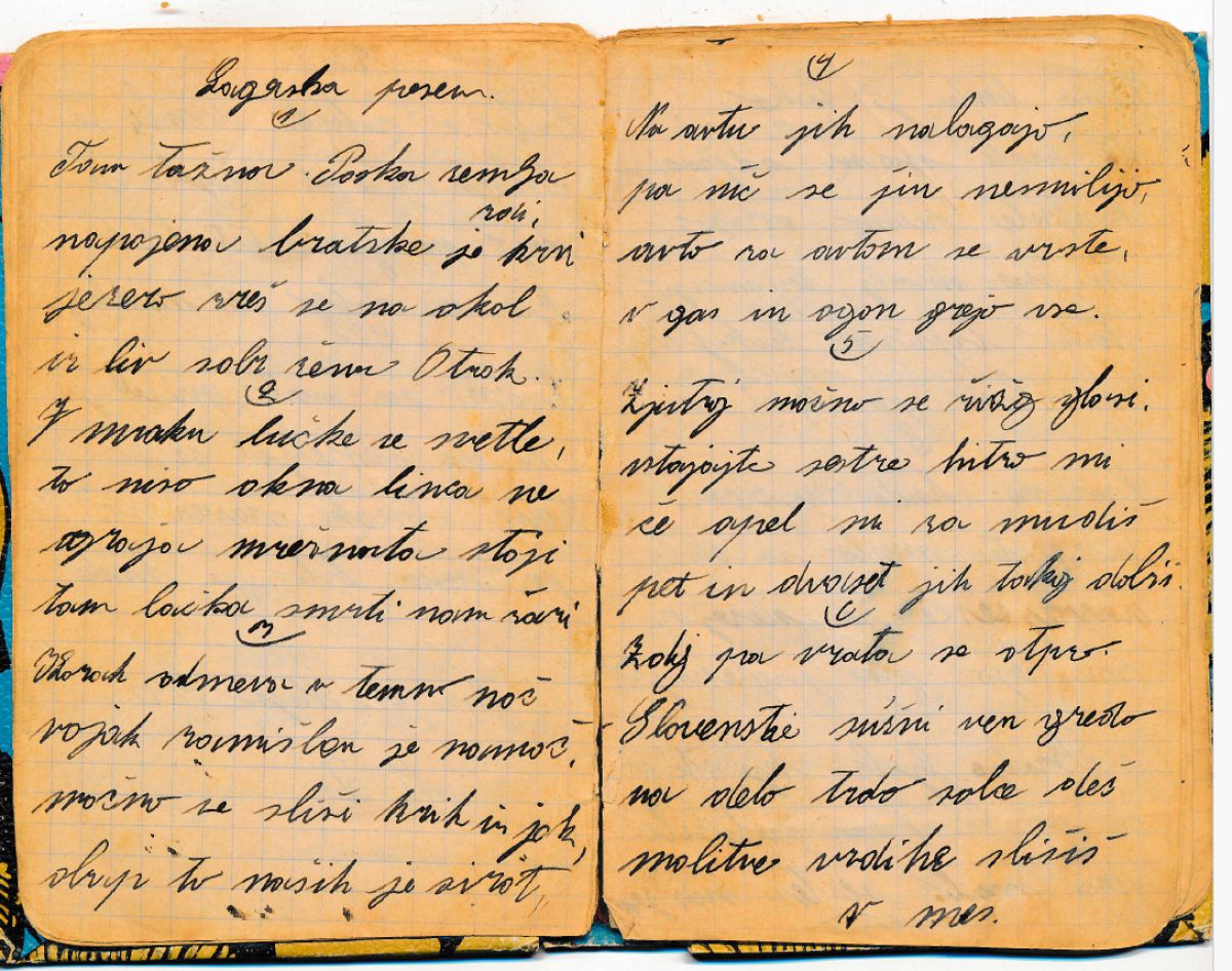 V nadaljevanju objavljamo stran iz beležnice Marije Friškovec, ki ga njeni potomci še danes skrbno hranijo. Marija Friškovec je bila leta 1942 odpeljana v Auschwitz in se na srečo vrnila živa. Po vrnitvi domov je v majhno beležnico med drugim zapisala pesem z naslovom Logarska pesem. Objavljamo prepis od 8. do12. kitice.