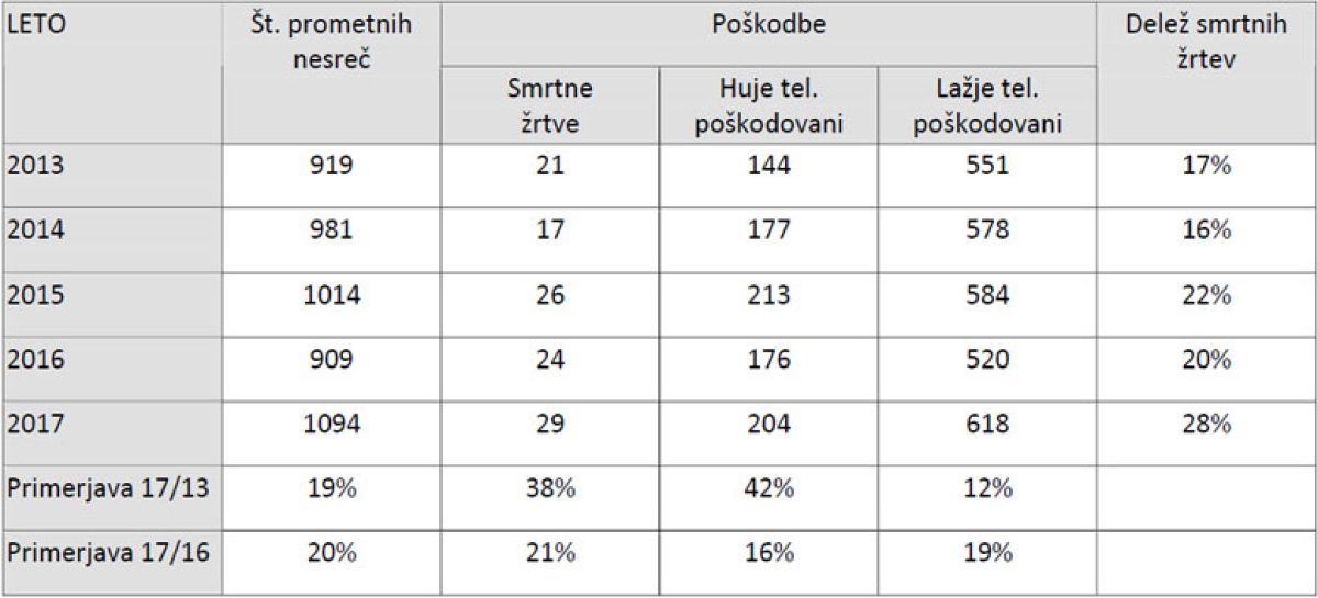 V letu 2017 se je na slovenskih cestah pripetilo 1094 prometnih nesreč z udeležbo voznikov enoslednih motornih vozil, to je 20 odstotkov več kot v letu 2016. Od tega je bilo 29 smrtnih žrtev, 25 motoristov in 4 mopedisti, kar je 21 odstotkov več kot v letu poprej. Med huje telesno poškodovanimi se je delež povečal za 16 odstotkov (iz 176 na 204), število lažje telesno poškodovanih pa za 19 odstotkov (iz 520 na 618). Najbolj izpostavljena starostna kategorija v preteklem letu so bili vozniki med 45 in 54 leti.
