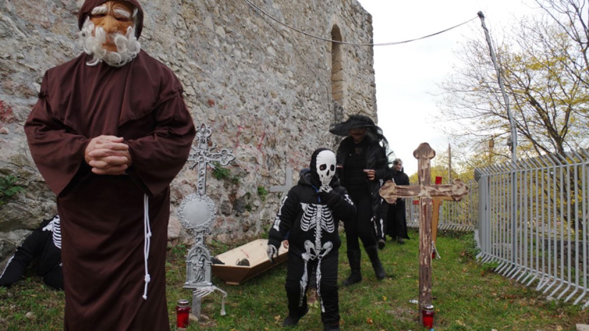 Sem si hotel privoščiti eno Laško, pa sem zagledal spet vrsto, ki je čakala pred vrati ograje in stražarja, ki ga prepoznam kot Marjana Prislana. Stopim v vrsto, saj želim čim prej priti na grad, da mi slučajno kakšen strahec ne uide. Ko le stopam proti razvalinam, me najprej okostnjak policaj usmeri na grajsko pokopališče. En okostnjak leži na tleh, drugi v trugi ob steni gradu. Čarovnica Klavdija mi pritisne žig na zemljevid. Ko že hočem iti naprej, se name skoraj prevrne okostnjak iz truge. Malo sem ga čudno pogledal, on pa me je očitno poznal, saj me je vprašal, če imam kak cigaret. Sem takoj vedel, da je moj brat Robi. Ta že ne straši. Zasliši se močan glas okostnjaka policaja, ki usmerja promet naprej. Glas mi je znan, seveda to je moj stric Zdravko, ki je Šalečan, domačin. Je že v penziji, a še vedno navihan in z vsemi žavbami namazan. Pridem do naslednjega straškota, ki stoji na miru in s svojo strašno masko zre v nas. Naenkrat prime v roko motorko, jo prižge in z bojnim krikom srhljivo prereže tišino. Malo je pomahal z njo levo in desno, da je zadišalo po nafti. Videlo se je, da motorka nima verige. Večina navzočih je zbežala naprej. Ko je strahec ugasnil motorko, sem ga potrepljal po rami, da se ne bi počutil osamljenega. Strahec me je vprašal, kako sem, pa mu povem, da v redu. Potem pa sva prasnila v smeh, saj je bil to moj brat Renato. Obdajo naju čarovnice, sestrične in druga žlahta, pa Anja z zelo dobro prestreljeno glavo. Tudi v gradu sta bili dve čarovnici, ki sta pripravljali razne zvarke in kovali zarote v skrivnostnem ambientu.