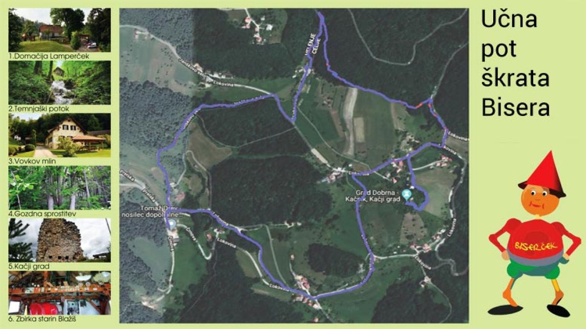Izdelali smo zgibanko v treh jezikih. Na voljo je v lokalih na Dobrni in Vinski Gori. Pri Lamprčku bodo lahko obiskovalci kupili spominček – škrata Bisera in magnet Učna pot.