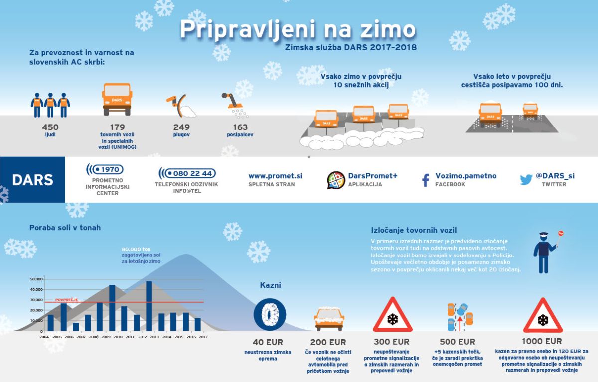 V družbi DARS imamo za zimsko sezono 2017/2018 pogodbeno zagotovljenih približno 80.000 ton soli ter približno 3.000.000 litrov kalcijevega klorida (za preprečevanja nastanka poledice). Ob napovedi snežnih padavin se njihove delovne skupine pripravijo na zimsko akcijo. Preden se sneg začne oprijemati vozišča, aktivirajo pluge in začnejo posipavati.