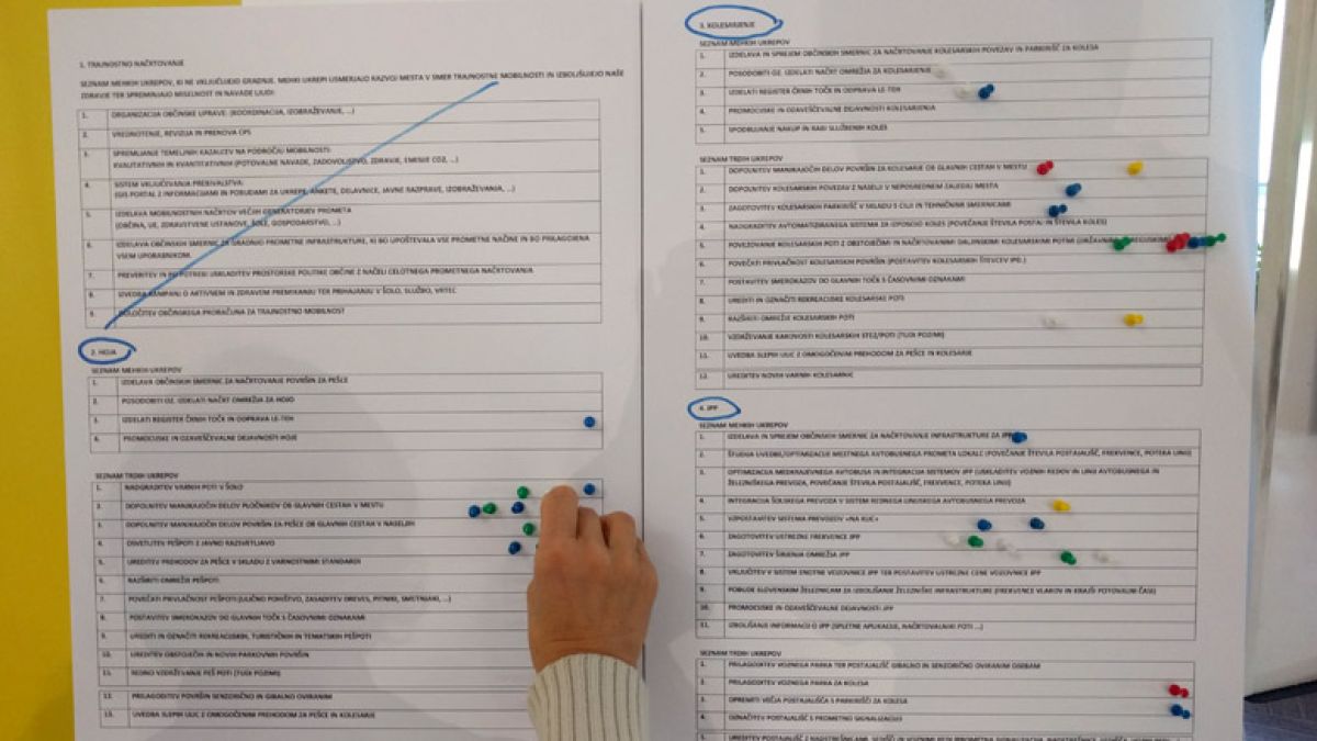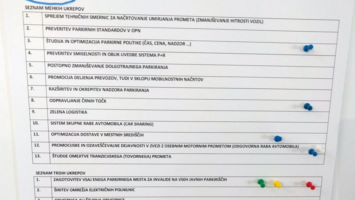 V nadaljevanju razprave so bili udeleženci povabljeni, da iz podanega nabora za posamezni steber izberejo njim najpomembnejše ukrepe in tako smo na koncu prišli do niza pomembnih ukrepov. Iz stebra ”hoja” je večina glasovala za ”dopolnitev manjkajočih delov pločnikov ob glavnih cestah v mestu” ter ”dopolnitev manjkajočih delov površin za pešce ob glavnih cestah v naseljih”. Iz stebra ”kolesarjenje” je večina glasovala za ”povezovanje kolesarskih poti z obstoječimi in načrtovanimi daljinskimi kolesarskimi potmi” ter za ”razširitev omrežja kolesarskih poti”. Iz stebra javnega potniškega prometa so glasovali za ”zagotovitev ustrezne frekvence JPP’, za ”širjenje omrežja JPP” ter za ”vzpostavitev sistema prevozov `na klic´”. Iz stebra ”motorni promet” pa je večina glasovala za ”zagotovitev vsaj enega parkirnega mesta za invalide na vseh javnih parkiriščih” ter za ”izboljšanje