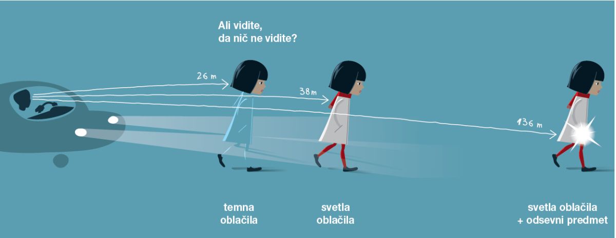 Največ prometnih nesreč z udeležbo pešcev se zgodi v jesenskih in zimskih mesecih, ko so dnevi krajši. V teh mesecih preživimo velik del dneva v temi, zato Agencija po Sloveniji razdeljuje 11.000 odsevnikov, da bi pešci postali bolj vidni. Vozilo, ki vozi s hitrostjo 40 km/h, pešca v temnih oblačilih opazi šele na razdalji 26 metrov, v svetlih oblačilih do 38 metrov, medtem ko odsevni trak omogoča, da pešca opazijo na razdalji do 136 metrov. Od leta 2019 do konca septembra 2024 je 29 pešcev umrlo v temnem delu dneva (več kot 42 % vseh primerov).