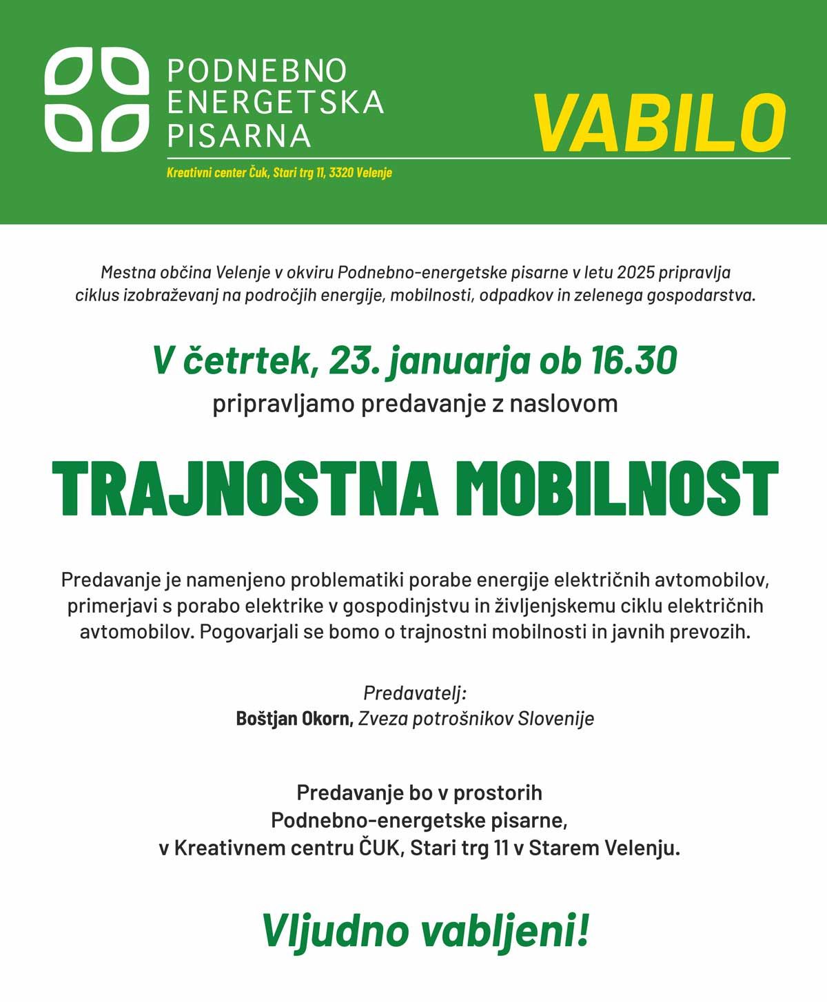 Predavanje bo v četrtek, 23. januarja ob 16.30 v prostorih Podnebno-energetske pisarne, v Kreativnem centru ČUK, Stari trg 11 v Starem Velenju. Predavanje je namenjeno problematiki porabe energije električnih avtomobilov, primerjavi s porabo elektrike v gospodinjstvu in življenjskemu ciklu električnih avtomobilov. Pogovarjali se bomo o trajnostni mobilnosti in javnih prevozih.