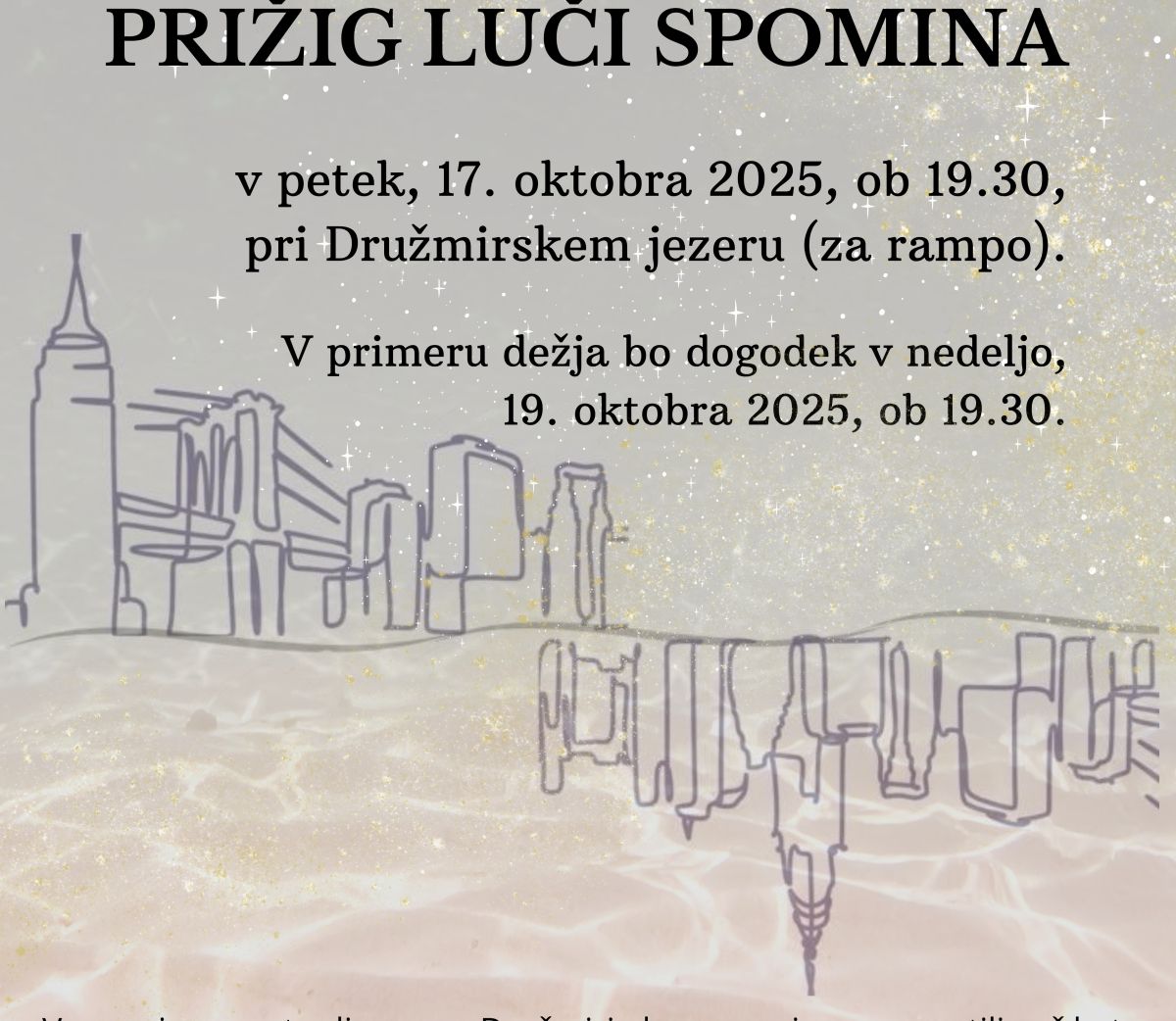 Zaradi nepričakovanega bolniškega staleža ključnih članov organizacijske ekipe je letošnji Prižig luči pri Družmirskem jezeru prestavljen za 14 dni. Dogodek bo potekal 17. oktobra, ob 19.30, v primeru slabega vremena pa 19. oktobra, ob 19.30.