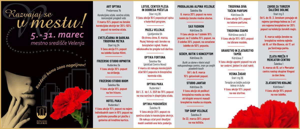 Že osmo leto zapored so trgovci pripravili privlačno ponudbo, ki jo ženam dajejo ob mednarodnem dnevu žena in materinskem dnevu. K projektu Razvajaj se v mestu je pristopilo 22 ponudnikov, ki vabijo z dodatnimi ugodnostmi. V sklopu akcije bo razdeljeno tudi 2.000 nageljnov, ki jih župan Mestne občine Velenje Peter Dermol podarja damam ob dnevu žena. Nageljne bodo že to soboto delili prodajalci, ki svoje domače izdelke ponujajo na mestni tržnici. Sodelujoči ponudniki pa bodo nageljne obiskovalkam trgovin in lokalov podarjali v ponedeljek, 8. marca.