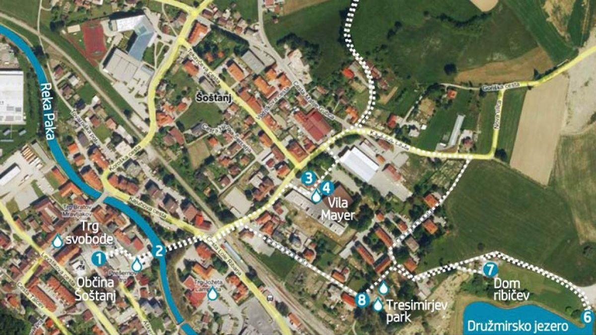 Krožna pešpot je dolga približno tri kilometre in z ogledi traja dve uri. Primerna je tako za otroke kot odrasle. Poteka ob cestah in urejenih poteh. Na poti je pet pitnikov s čisto vodo iz javnega vodovoda. Pot razkriva zanimivosti v mestu Šoštanj, povezane z vodo, ki se kažejo v naravni in kulturni dediščini. Pohodniki pokukajo v globino starega vodnjaka, prečkajo reko, si ogledajo bazenček za kopanje v meščanski vili ter umetniški kip vodne nimfe, se spustijo v opuščen vodohran, sprehodijo do jezera in si ogledajo kapitalni ulov – velikega soma.